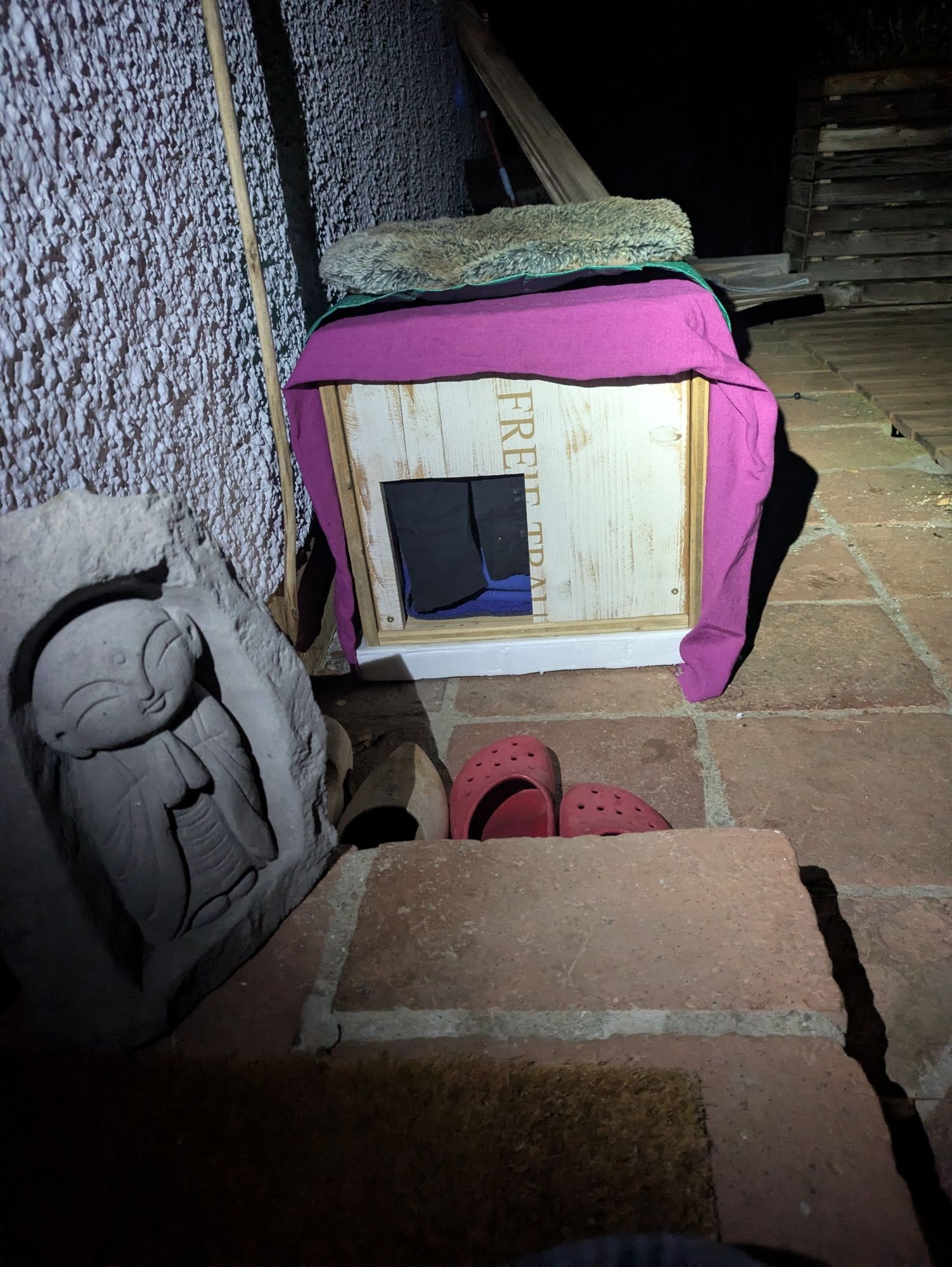 Gestern Abend ist das Katzenhaus aus Holz fertig geworden und hat die große Transportkiste vor dem Haus ersetzt.