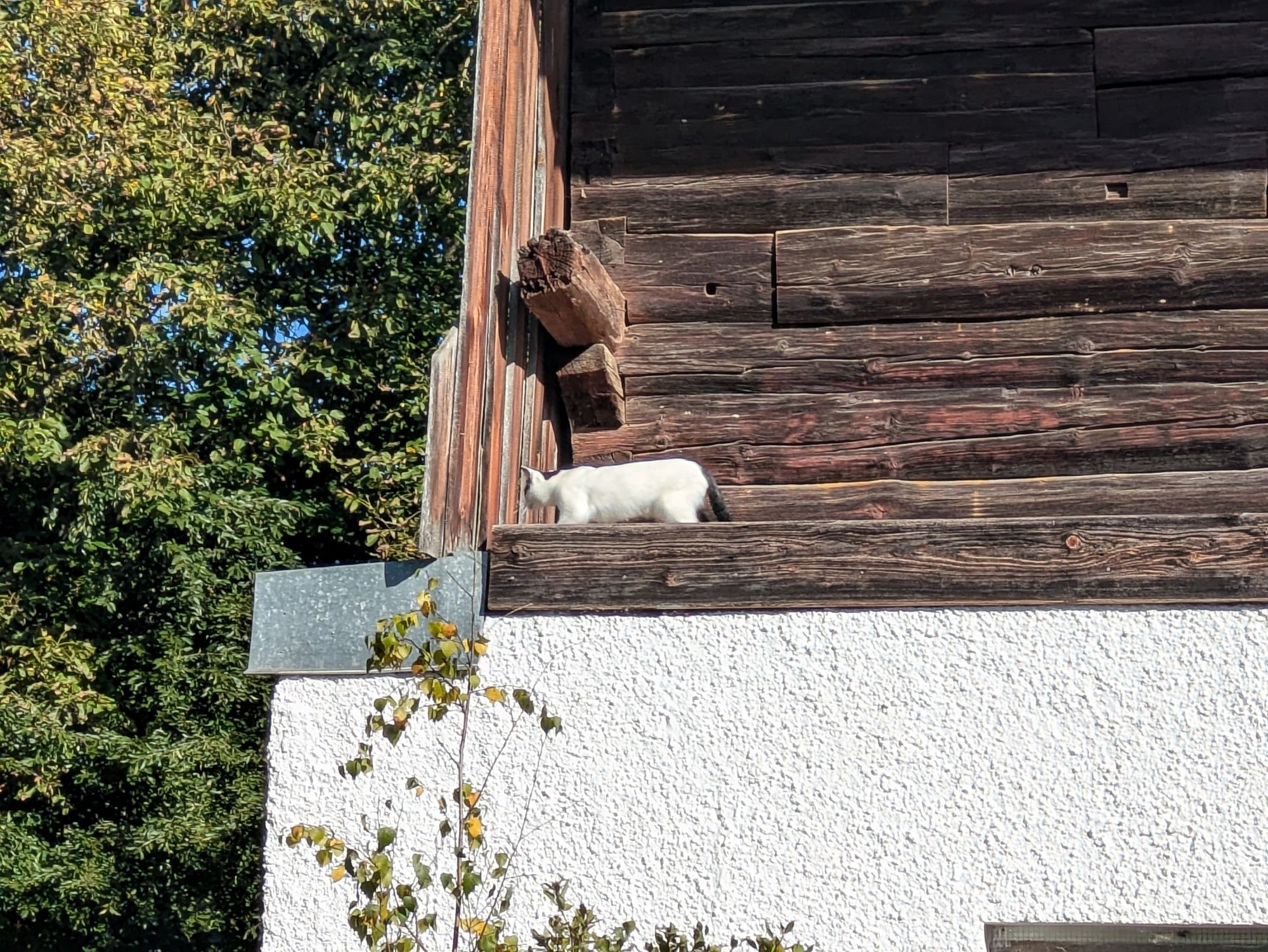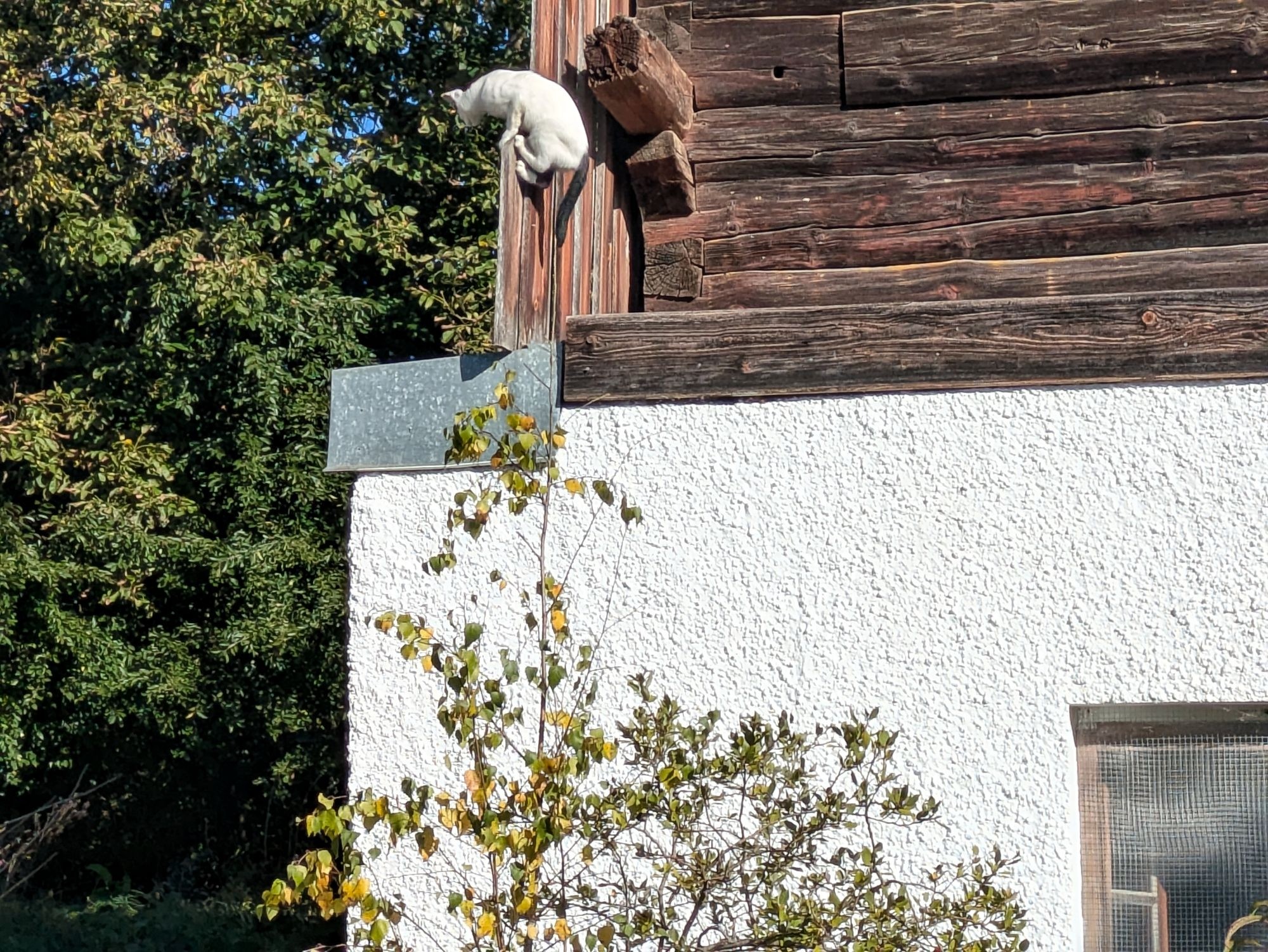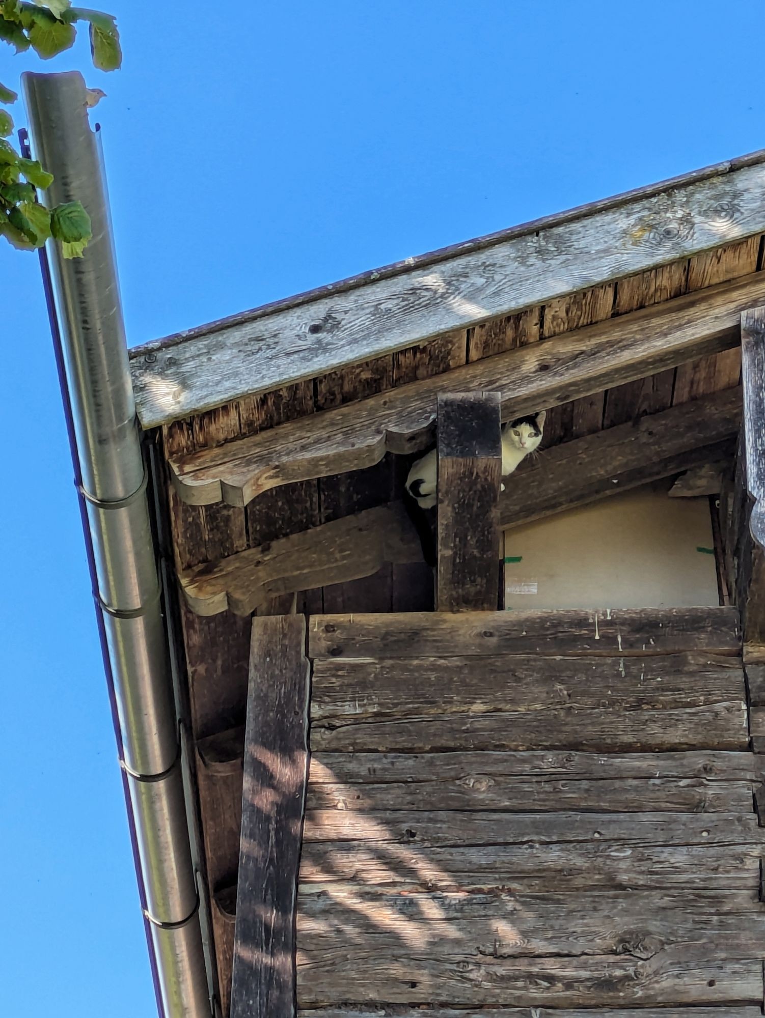 Und dann beobachtete M, wie sie im Schnellverfahren den äußersten senkrechten Balken am Balkon hoch kraxelte und dann unterm Dach saß und auf die Vögel in der Regenrinne spekulierte.
