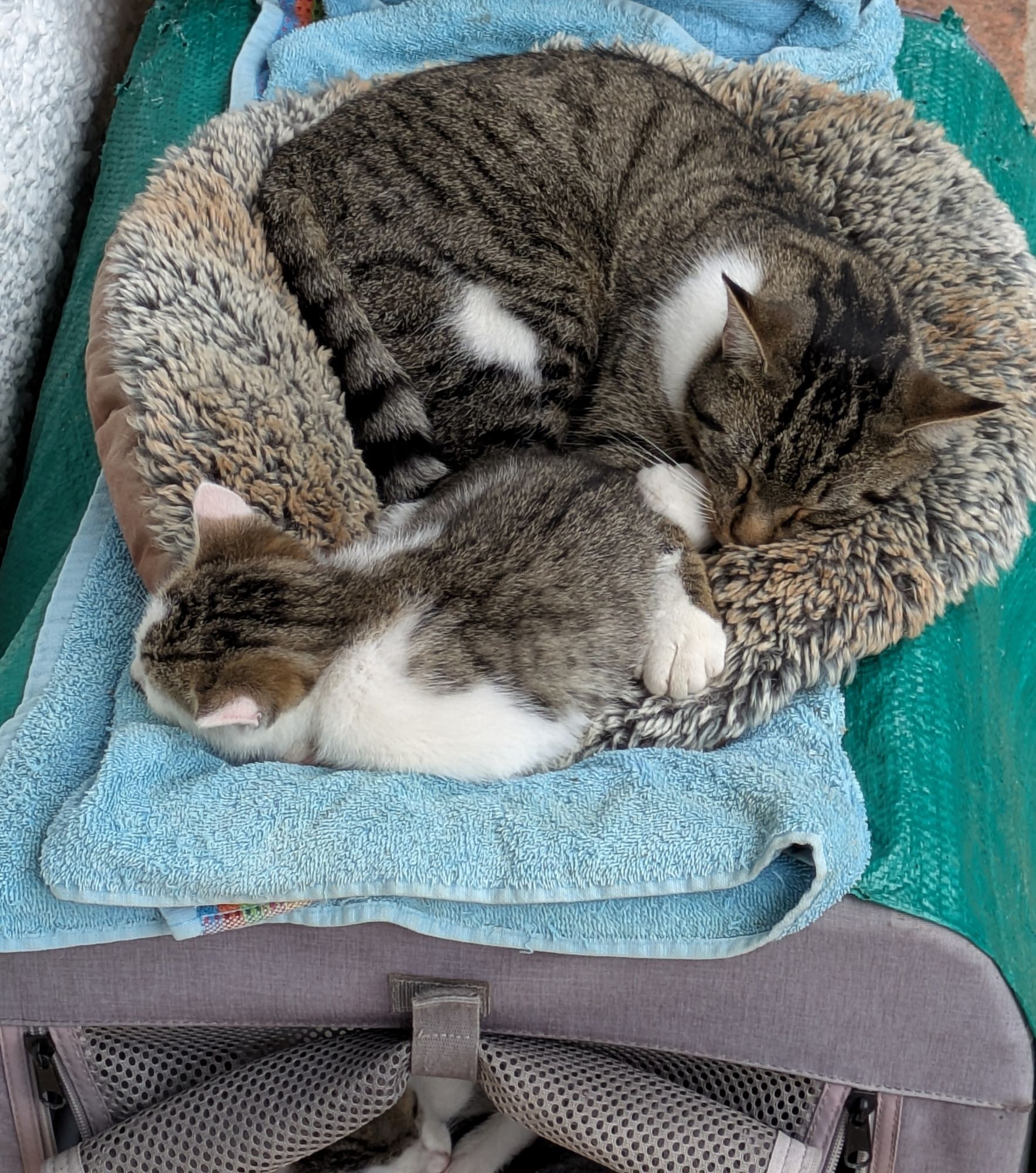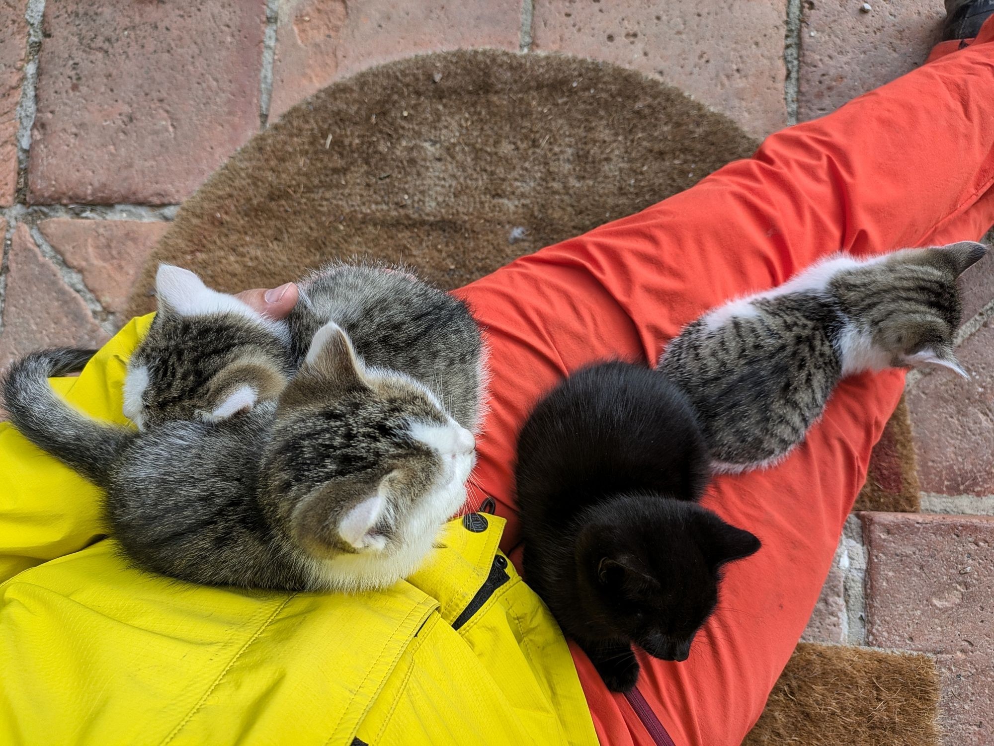 Und jetzt komme ich auch nicht mehr weg, weil sie nach dem Klettern auf mir beschlossen haben, dass eine warme Unterlage zu schlummern einlädt.