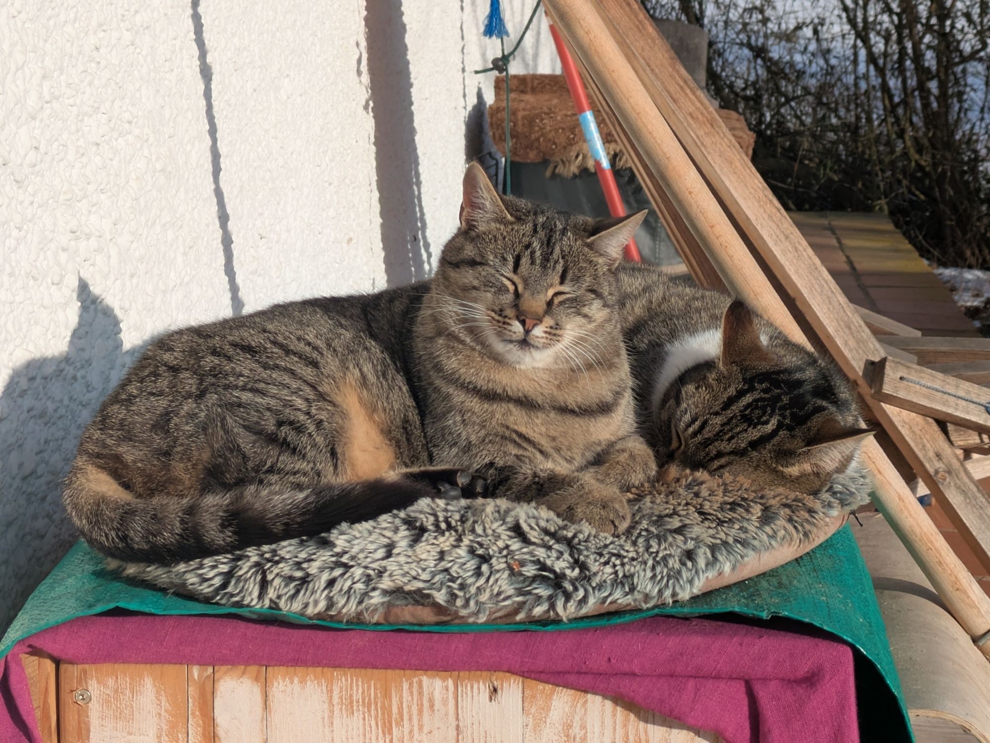 Schon lange habe ich unsere beiden großen Draußen-Katzen nicht mehr so eng aneinander gekuschelt gesehen.