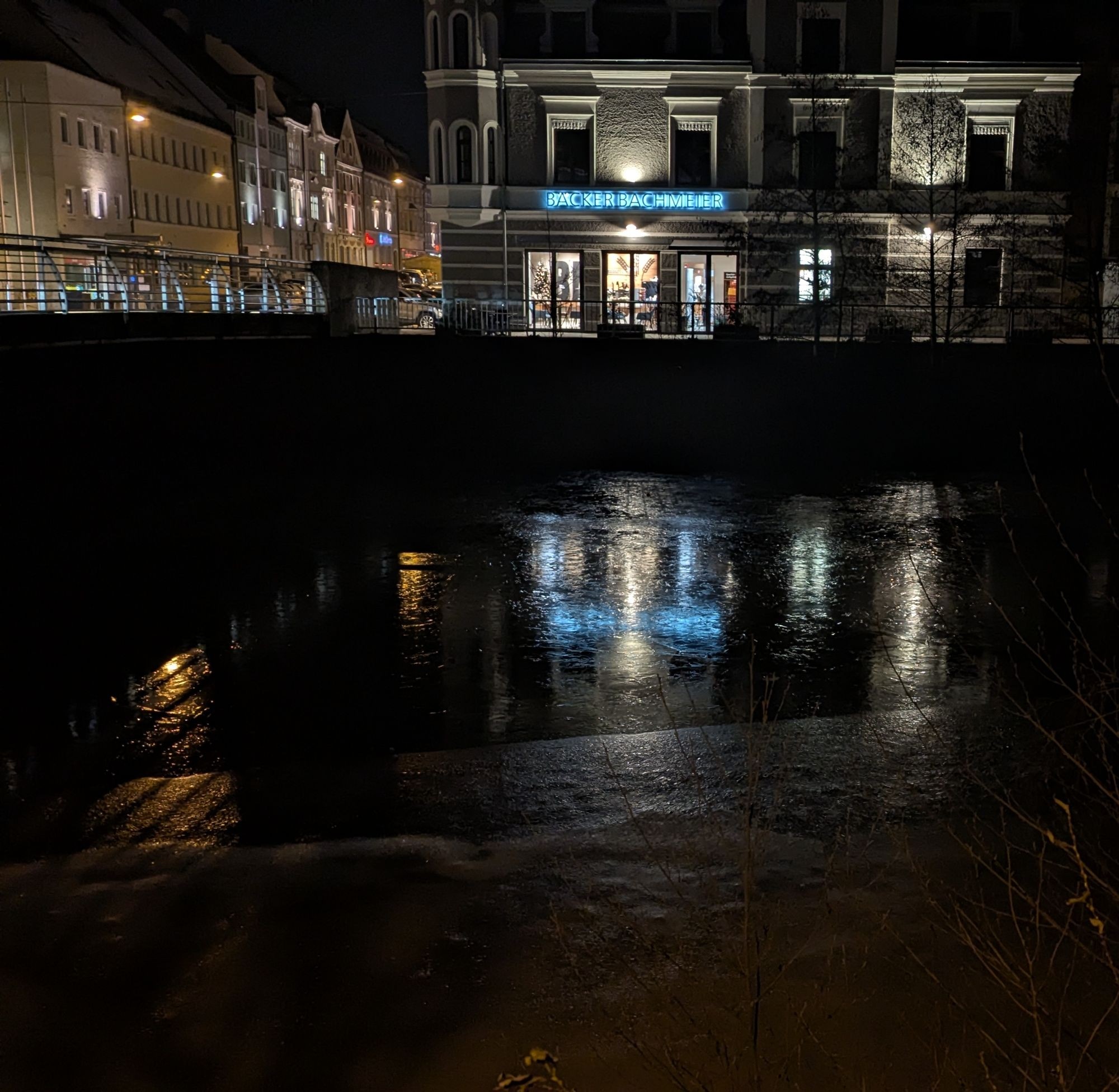Gestern Abend war die #Vils in #Vilsbiburg zugefroren. in der zugefrorenen Vils spiegeln sich abends die Lichter der Häuser