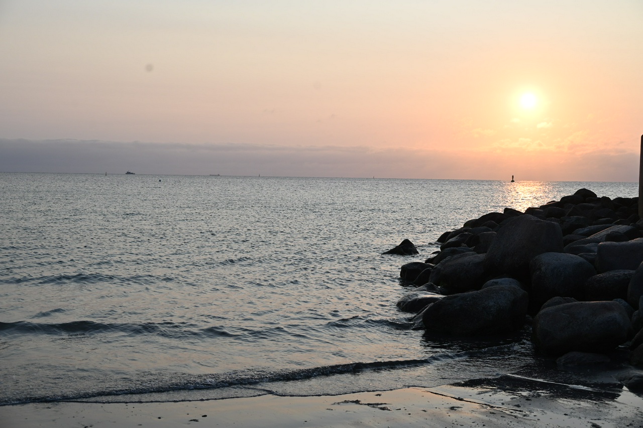 Sonnenaufgang über dem Meer mit kleinen Wellen und felsigem Stein im Vordergrund.