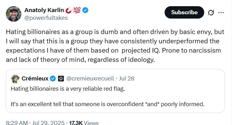 viewSo instead of feeling slightly jealous toward billionaires and then moving on with life like the rest of us. Anatoly feels extremely jealous that he can't just forget in three seconds and has to insult everyone else for having an emotion to prove that he himself has only positive feelings.
