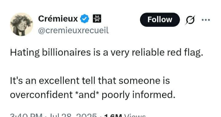 Rationalization: actually billionaires creates many jobs. Some of them even use the money for innovation. Some of them are even down to earth. Those are all net positive to the society. Whoever don't see that and still feel jealous because they can't rationalize as much is because they are low IQ.