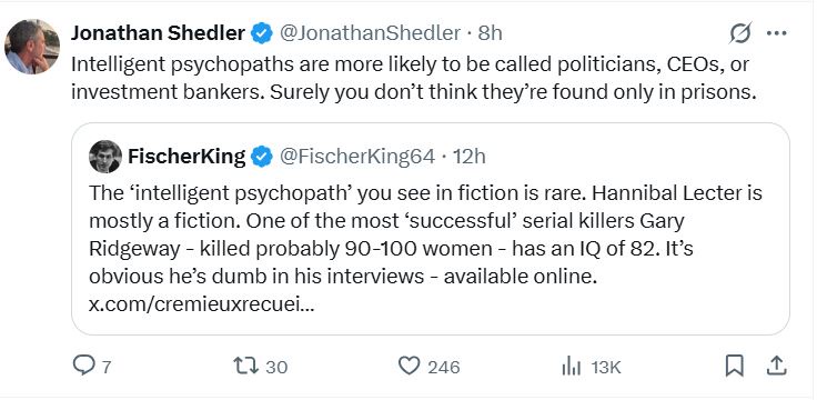 viewYes. Because when you have above average IQ with an innate thirst for cruelty, it’s more likely that you like math and have elite parents.