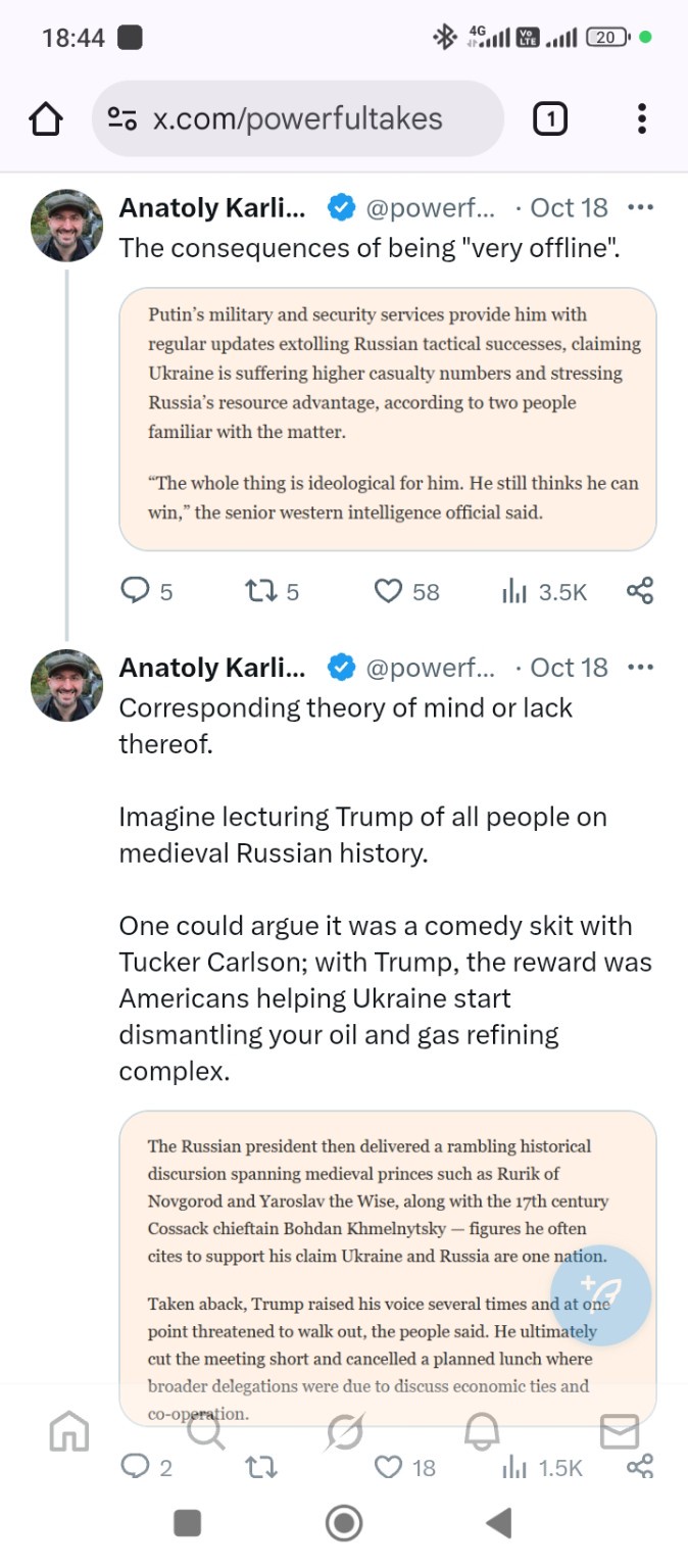 viewSo Putin, thinks Trump, Biden, Xi, his driver and Trump’s hairstylist all have the same information, knowledge of everything as him. And they, as a group, also share the internal worldviews as him. But he goes on to lecture Trump about things anyway because that’s his special interest.